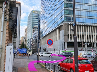 A4出口より出られた方は正面の角を右に曲がります。
