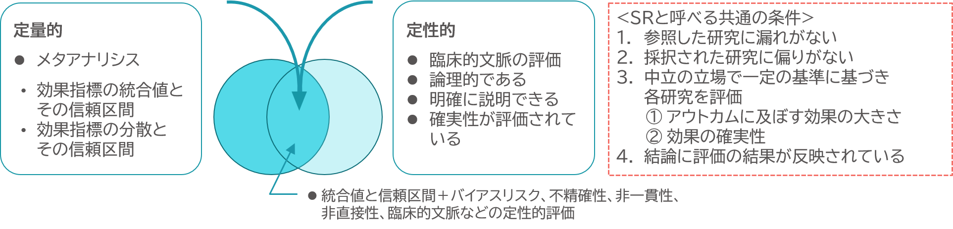 クリニカルクエスチョンに対して、研究を網羅的に調査し、研究デザインごとに同質の研究をまとめ、バイアスを評価しながら分析・統合を行うこと。