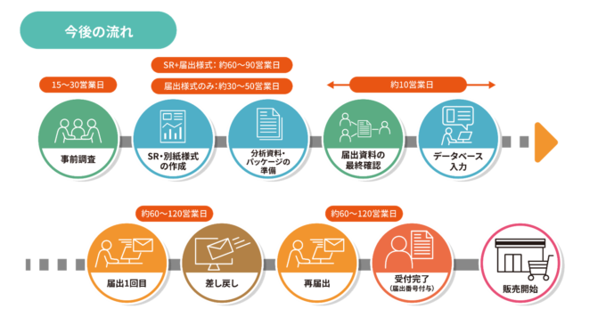 届出について、「新規成分等※以外」の場合は、届出後60営業日で受付が完了します。一方、「新規成分」の場合は、当初、届出の期間が60営業日とされていた場合であっても、消費者庁長官が認める場合として120営業日になることもあります。