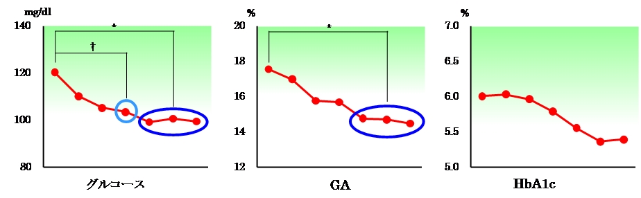 血糖値が高めの境界域の方を対象にした、血糖値低減効果をみた有効性ヒト試験です(期間は3か月)。血糖値がまず下がり、その後グリコアルブミン(GA)が下がり、さらにそれらを追うようにHbA1cが下がっていくのがわかります。このように複数のマーカーを組み合わせて糖代謝能を測定していくことで、製品の有効性・安全性を科学的に示すことができます。