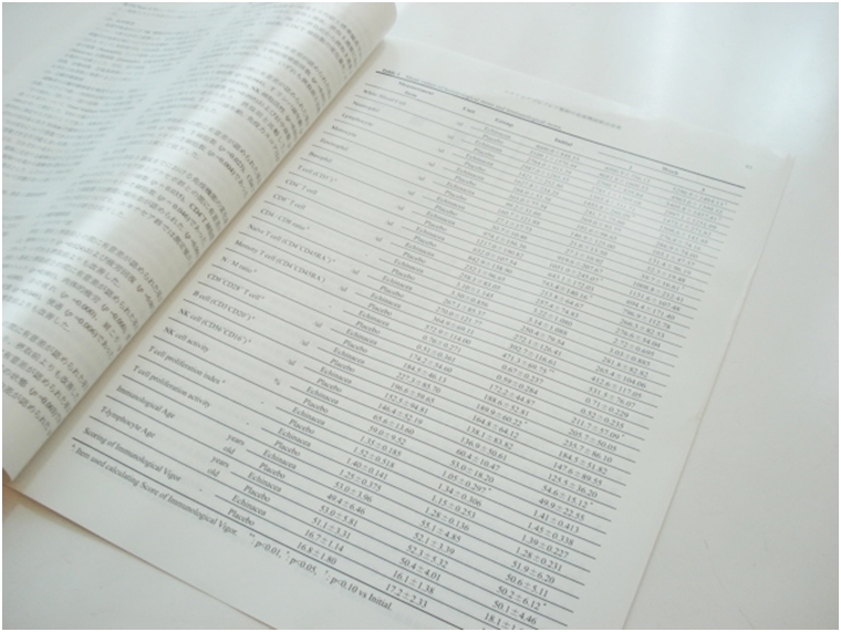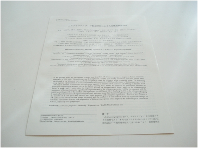 藤井文隆, 橋本俊嗣, Marian Verbruggen, 鈴木直子, 椎塚詰仁, 山本和雄, 宇津山正典, 廣川勝昱, 髙良毅. エキナセアプルプレア製剤摂取による免疫機能賦