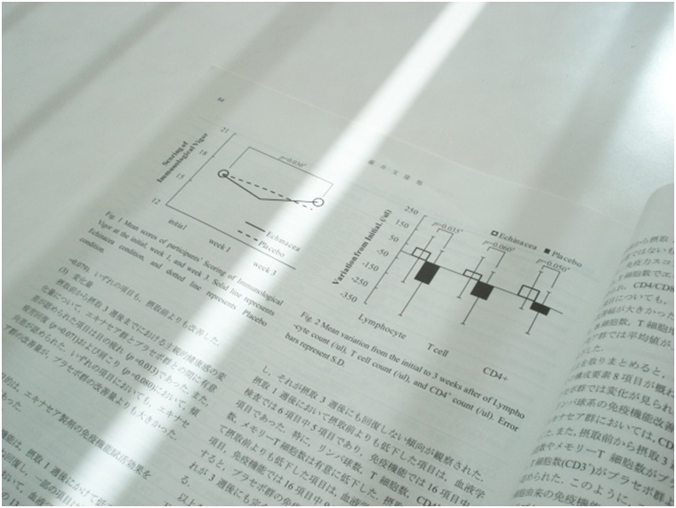 エキナセアとは、欧米、特にネイティブアメリカンの間で万能薬として伝統的に用いられてきた植物です。今回の試験では、エキナセアのエキスを含有する製剤について、T細胞系を中心に、免疫賦活機能の検討を行いました。その結果、エキナセア製剤がT細胞系を賦活する作用を有することが示唆されました。