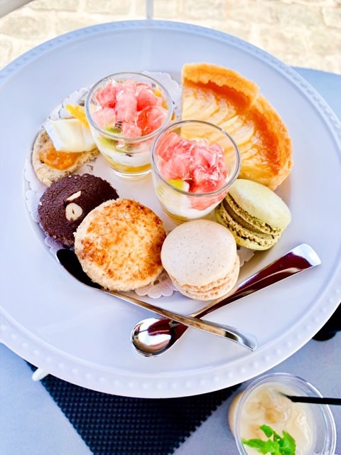 お料理は、季節のフルーツやケーキ、スコーン、サンドイッチなどがカラフルに盛り付けられています。