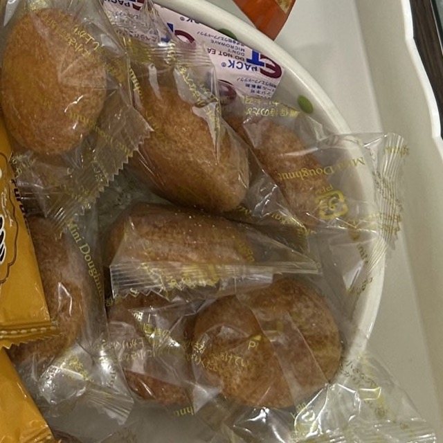 ついにあんドーナツが来ました。しかも、特に私が好きな、一つあたりが小さめで周りに砂糖がまぶされているミニあんドーナツです。周りの砂糖から始まり、中心部へと「掘削」を進めていきます。ドーナツ生地も餡も、甘くてたまりません。餡の中にわずかに感じられる豆の皮の舌触りが、また良いものです。