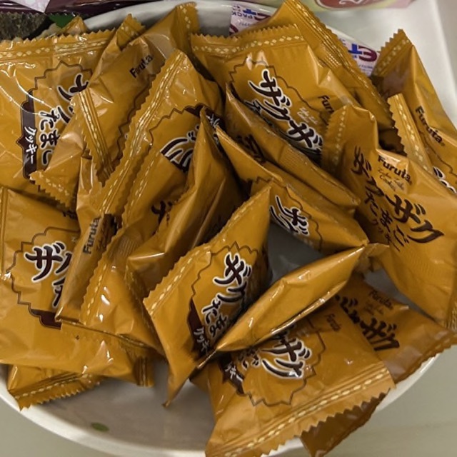 ミックスナッツとはまた別物で、おかきやしょうゆ豆が入っています。入社時から「おつまみコーナーにあるな」とは思っていたのですが、飲酒をしないことで有名な私は食べたことがありませんでした。しかしあるとき、あまりの空腹に耐えかねた私は「おつまみだけ食べても良いじゃないか」と思い、ついに食べてみたのです。するとあまりのおいしさに大ハマり。複数種類の菓子が入っているので、口内に流し込むとその情報量に圧倒されてたまりません(褒め言葉)。あまくてしょっぱくて、カリッとしてボリっとして、要するに味と食感の両方について脳に情報が押し寄せて来るのです。そして、個々の味や食感が同時に押し寄せて混ざり合うことでさらなる段階への昇華が起こります。すっかり虜になった私は、この食べ物を毎日一袋流し込むようになりました。これからも(他の人も食べられるように配慮はしながら)流し込んでいきます。