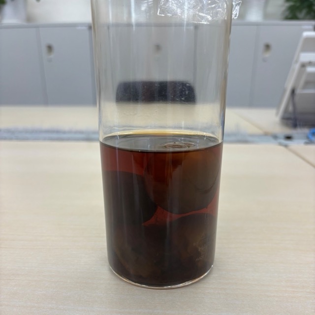 作成時には周りから「砂みたい」と言われていましたが、時間とともにしっかり溶け、深みのある色合いになりました。味も梅の風味をしっかり感じられる、飲みごたえのある梅酒に仕上がっていました。