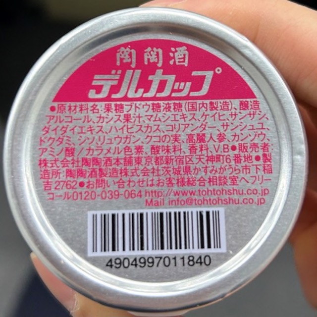 「陶陶酒 デルカップ甘口」です。梅酒と同じカップ酒ですが、種類としては「薬味酒」です。