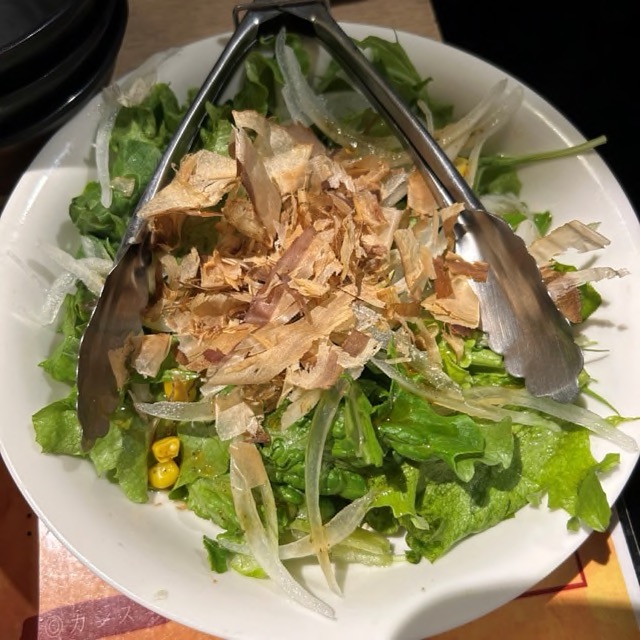 最もおいしかった料理は地鶏の炭火焼きでした。まずはともに盛り付けられたサラダで状態を整えます。そして鶏をいただきます。ちゃんと加熱されていると同時に柔らかく、炭火の香ばしさが脳を焼く!!!柚子胡椒も追加することで、香ばしさと爽やかさの同居を体験することができました。