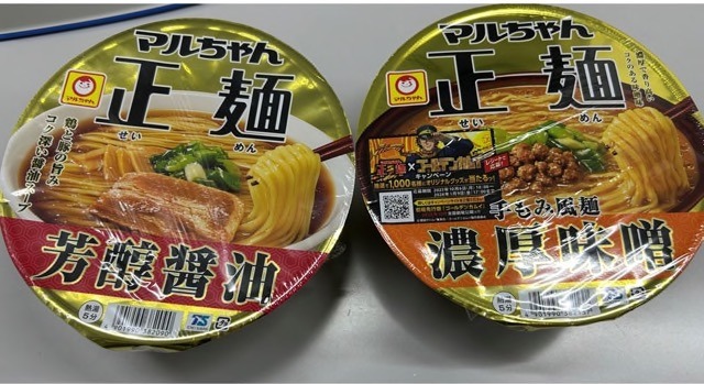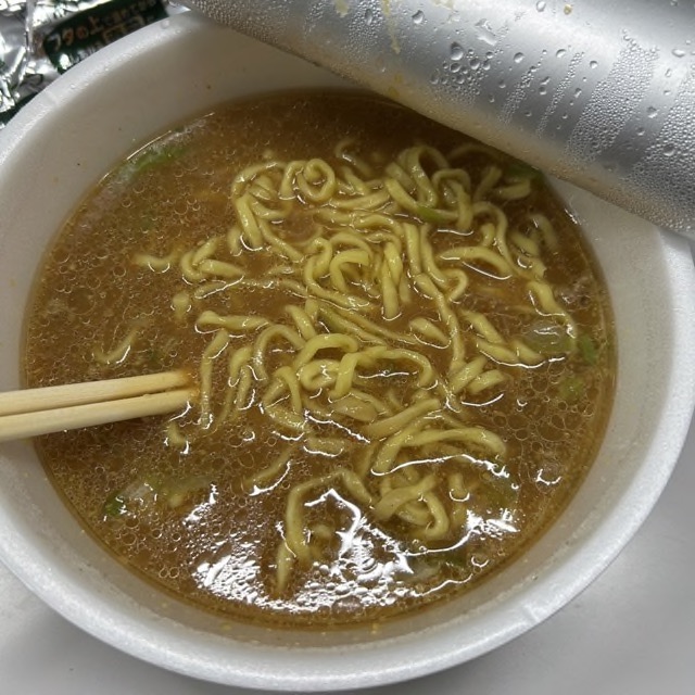 大きい金色の容器が特徴的なカップのラーメンです。ノンフライ麺という表示はありませんでしたが、他の社員のみなさんがおいしそうに召し上がっているのを見て試さずにはいられませんでした。休憩スペースからこの良い香りがしてきて、何度食欲が加速したことか。