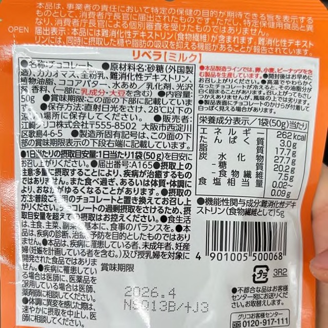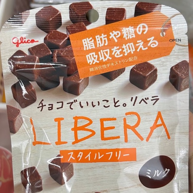 「LIBERA」シリーズの商品を調べたところ、味としては他に「ビター」や「カカオ50」、「香ばしパフ&アーモンド」がありました。そして表示している機能性によっても複数の種類の商品があり、この「脂肪や糖の吸収を抑える」(機能性関与成分: 難消化性デキストリン) の他に、「目の疲労感を軽減する」(機能性関与成分: アスタキサンチン)や「指先の冷えを軽減する」(機能性関与成分: モノグルコシルヘスペリジン) というものも販売されていたようです。