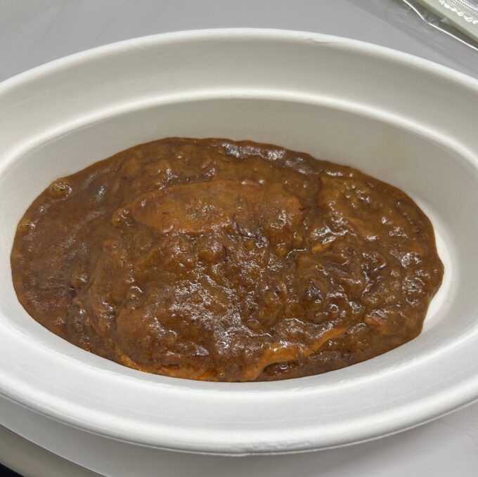 いただいて最初に出てくる感想としては、玉ねぎがすごい。溶け切っているものからしっかりと形を残しているものまで大きさの表現の幅が広い。大きく形を残しているものは食感と甘味がしっかりと感じられるが、シャキシャキとしているわけではなくやわらかい。